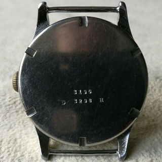 Type 1 watches use the standard dial, hands, 3190 case and 82A-24 movement as described above. The movement holder/spacer is made of solid base metal and the case back bears the usual 3190 case number. The DH number is neatly, evenly, stamped with small, square, serifed letters and numbers on the back in the same font as the case number. The D and H are often spaced widely either side of the number. The inner case back is stamped CB within an arched square or ‘loaf’ shape. This is the mark of the Central Watch Case Company.